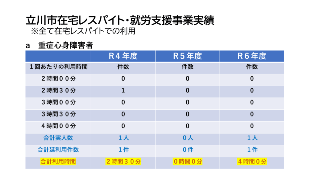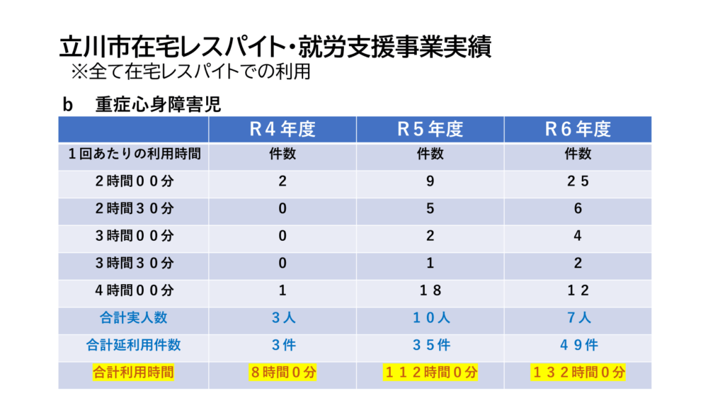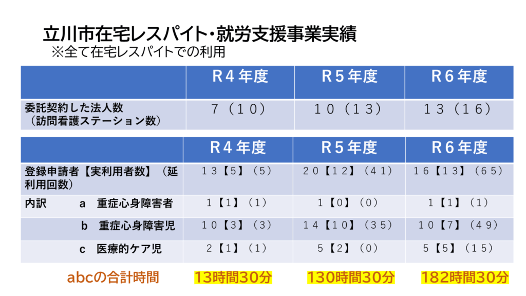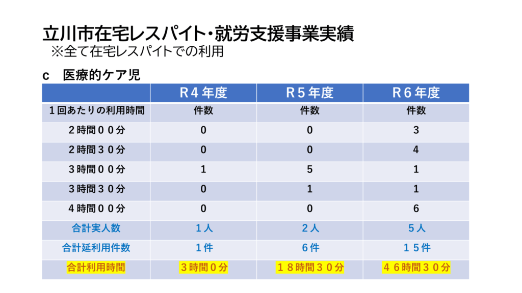Q.本市の在宅レスパイト・就労等支援事業の利用実績を見ると、実際に本事業を利用した人数は、事業の始まった令和4年・2022年度5人だったのに対し、令和5年度12人、令和6年度13人と、7~8人増えたのに対して、延べ利用回数は5回、41回、65回となっていてまさに8倍、13倍と増えている。つまり、特定の方が利用回数を伸ばしているということが読み取れ、医ケア児支援者会議でも言及されていた。利用者を拡大していくことで日頃ケアを行うご家族の皆さんのリフレッシュ、生活向上、虐待予防につながると考えるが、見解は。