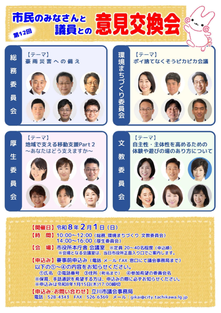 市民のみなさんと立川市議会議員との意見交換会が来年2月1日に開催決定!!