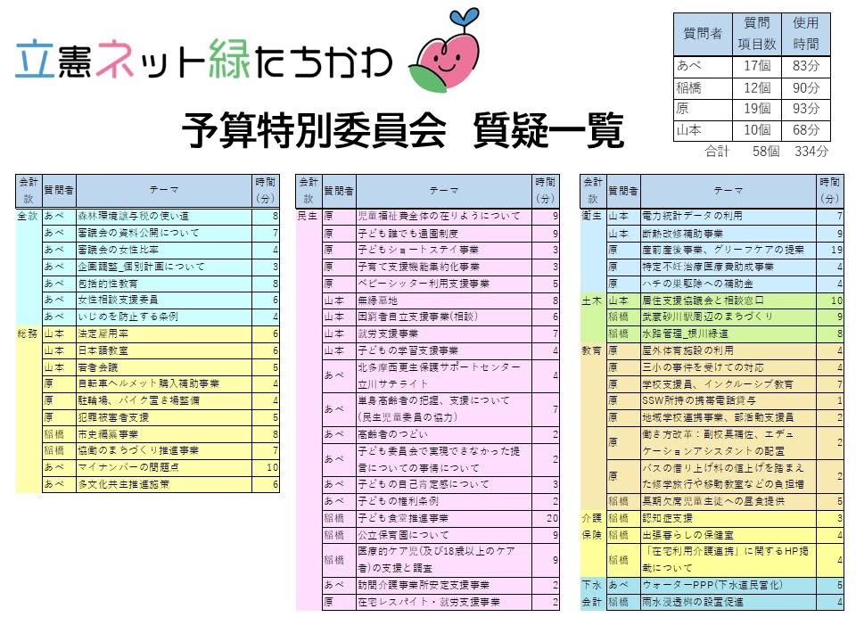 本投稿の最初に添付した表は、同じ会派の山本市議が時間管理をしてくださったものを活用させていただきました。